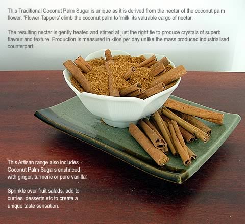 This traditional Coconut Palm Sugar is unique as it is derived from the nectar of the coconut palm flower. “Flower Tappers” climb the coconut palm to ’milk’ its valuable cargo of nectar. The resulting nectar is gently heated and stirred at just the right time to produce crystals of superb flavour and texture. Production is measured in kilos per day unlike the mass produced industrialised counterpart.  This Artisan range also includes Coconut Palm Sugars enhanced with ginger, turmeric or pure vanilla and cinnamon.