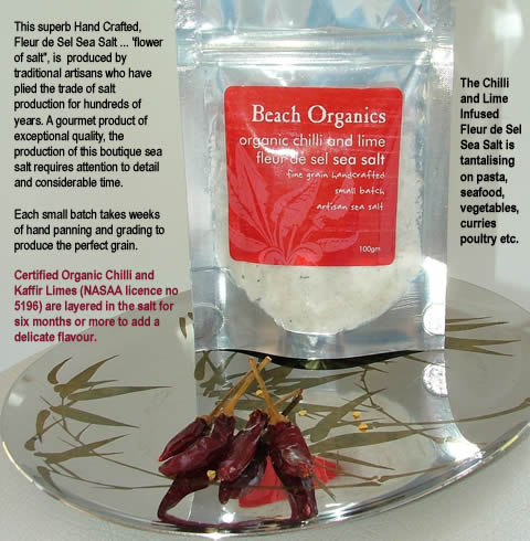 Certified Organic Chilli and Kaffir Limes (NASAA licence no 5196D) are layered in the salt for six months or more to add a delicate flavour. This superb Hand Crafted, Fleur de Sel Sea Salt … ‘flower of salt”, is produced by traditional artisans who have plied the trade of salt production for hundreds of years. A gourmet product of exceptional quality, the production of this boutique sea salt requires attention to detail and considerable time. Each small batch takes weeks of hand panning and grading to produce the perfect grain. The Chilli and Lime Infused Fleur de Sel Sea Salt is tantalising on pasta, seafood, vegetables, curries poultry etc.